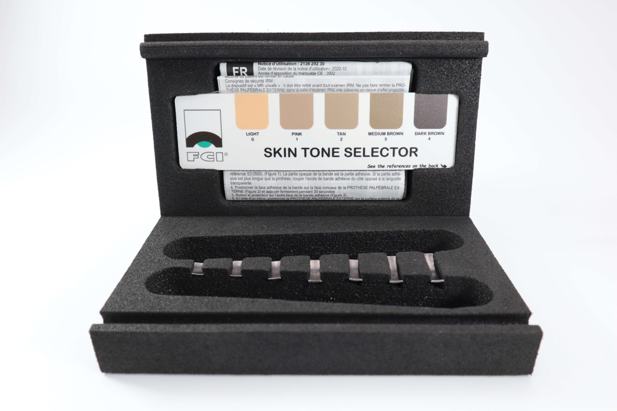 • A skin tone selector card to determine the eyelid weight that best approximates the patient’s skin complexion